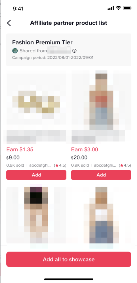 Step 3: If you receive a product list link, open it and accept the terms and conditions. You’ll see all the products included in the campaign. From there, you can either add all products to your showcase or select them individually. Click into any product to view details and confirm the commission rate, then tap Add to Showcase. The commission shown is the rate you’ll be paid through the agency—not the seller.