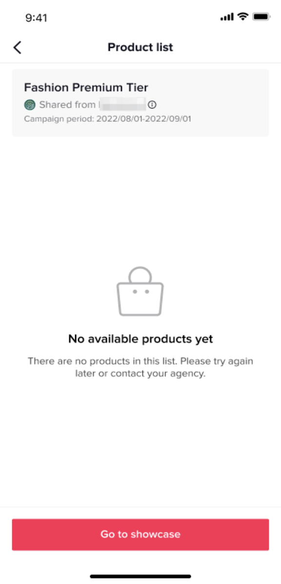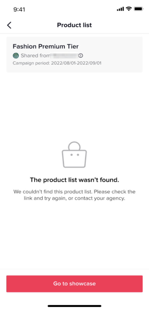 Step 5: If after entering a link, a Creator receives a No available products yet or The product list wasn't found message, it means that the campaign does not have any products in it yet or that the agency has deleted the product or list.